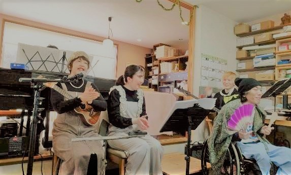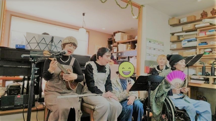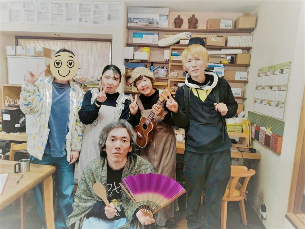 利用者さんの退院祝いに演奏しようとカホンのOさんが加わる